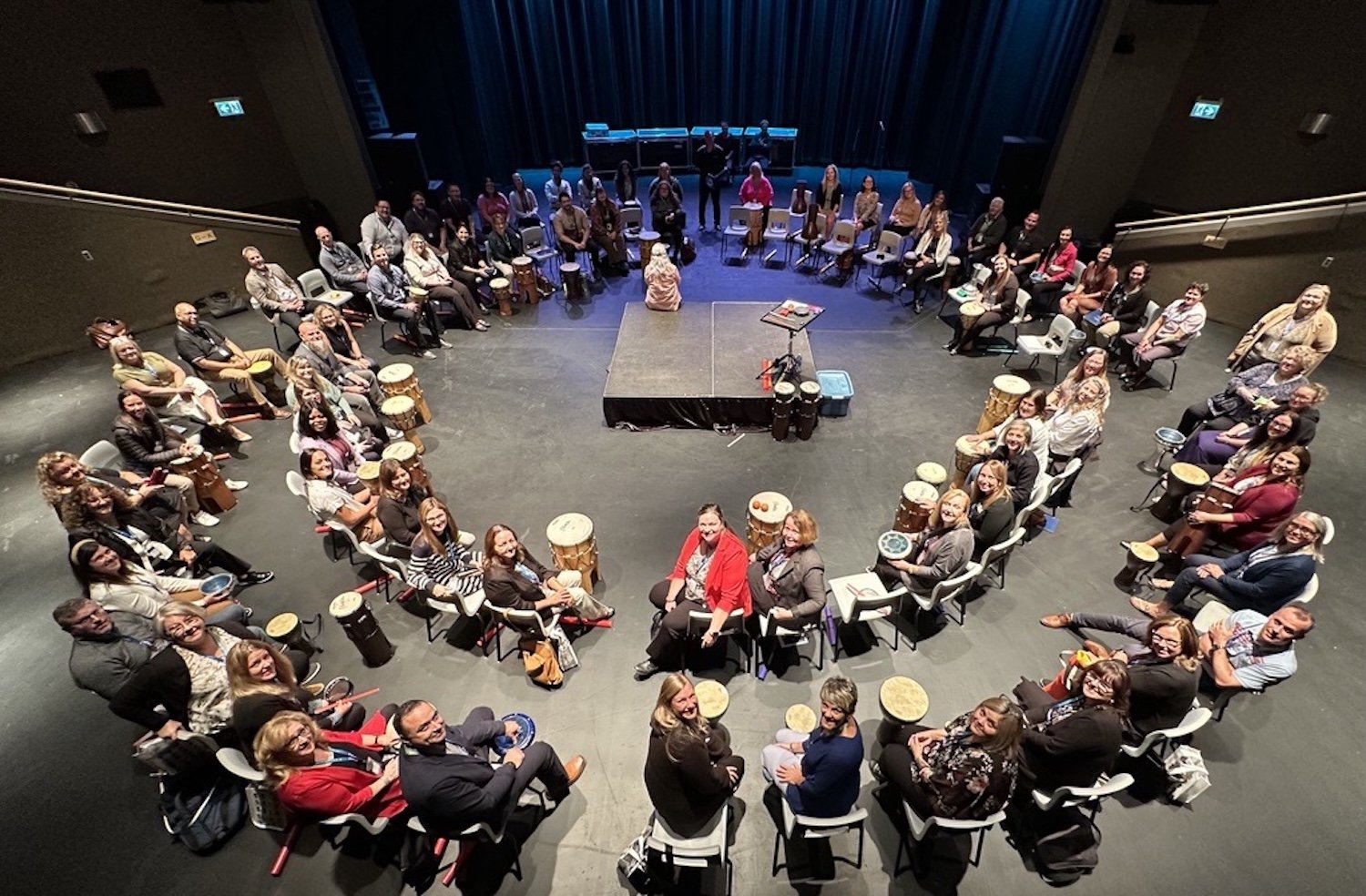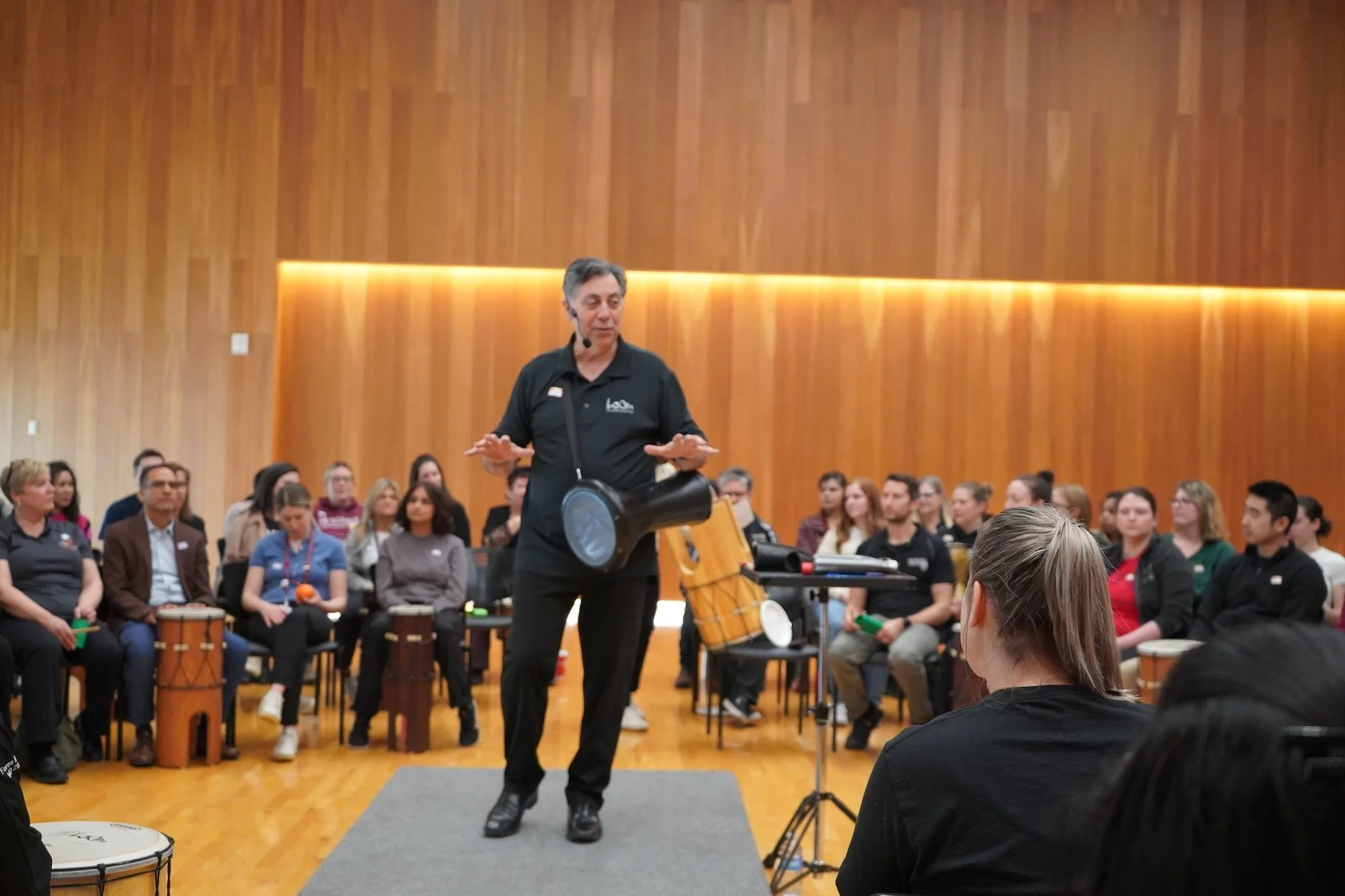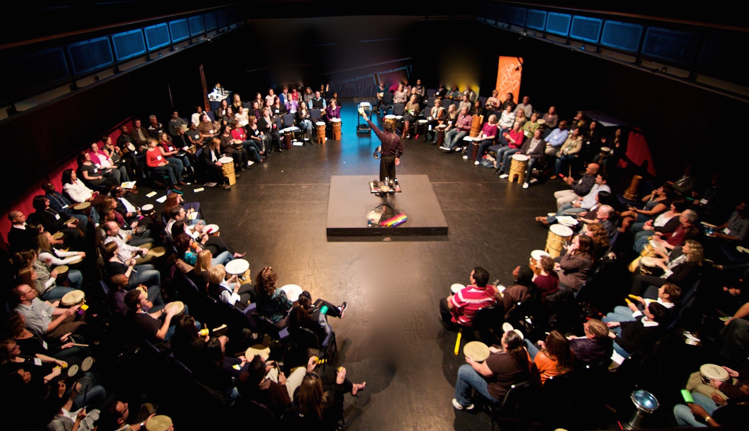 Facilitated percussion programs for government, healthcare, education, and large corporate organizations working with 50–400+ participants. Designed for inclusion, clarity, and impact in large, complex group settings.